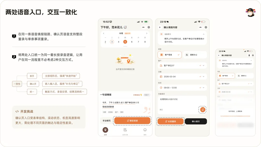 原因在于:这两个入口虽然位置不同,但本质上都属于 同一条语音填报链路 。尤其在确认页,语音并不只是“补充输入框”的能力,它还承担了 整段长按重录 和 单个外勤事项补录 的作用。