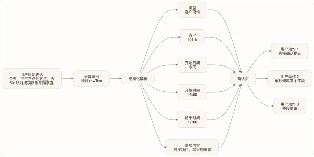 - 系统解析: 把语音先转成文本,再转成结构化字段