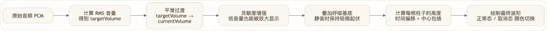 这里的波形是“真音量驱动”的:录音会产生 原始声音数据 ( PCM ,可以理解为最原始的声音采样点),我会用 RMS (可以理解为“把这一小段声音的强弱做一个平均”)算出 当前音量 ,再把它映射到 0~1 的范围,用来驱动波形高度,也就是说话越大声,波形越高;停顿或变小声,波形就会跟着变弱。