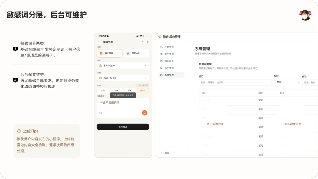 这两类词都支持在后台配置和维护。这样做的好处是,系统既能满足基础合规要求,也能随着公司的业务变化,动态调整自己的内容校验规则。