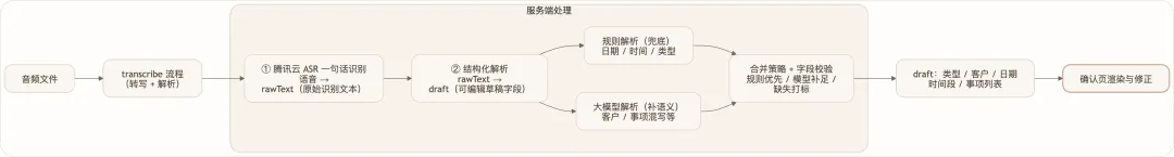 这份草稿( draft )是由服务端的 transcribe 流程产出的。这里的 transcribe 你可以把它理解为“ 把音频转成可填表的草稿 ”这一整步:先把语音 转写成文字 ,再把文字 解析成结构化字段 ,最终把结果交给确认页。
