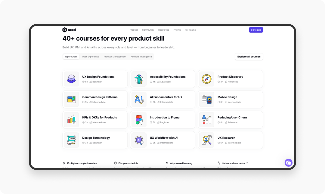 这几乎是语言学习产品的通用设计策略。语言学习内容庞大,用户需要从易到难、从浅到深逐步推进。将课程拆分为不同单元并清晰展示,能让用户对学习目标和进度一目了然,有效提升学习效果。这让我想起另一款职业在线教育产品 Uxcel 的课程设计——虽然它不是语言学习类产品,但采用了另一个维度:按场景划分,将 UX 学习按不同知识点和应用场景分开。