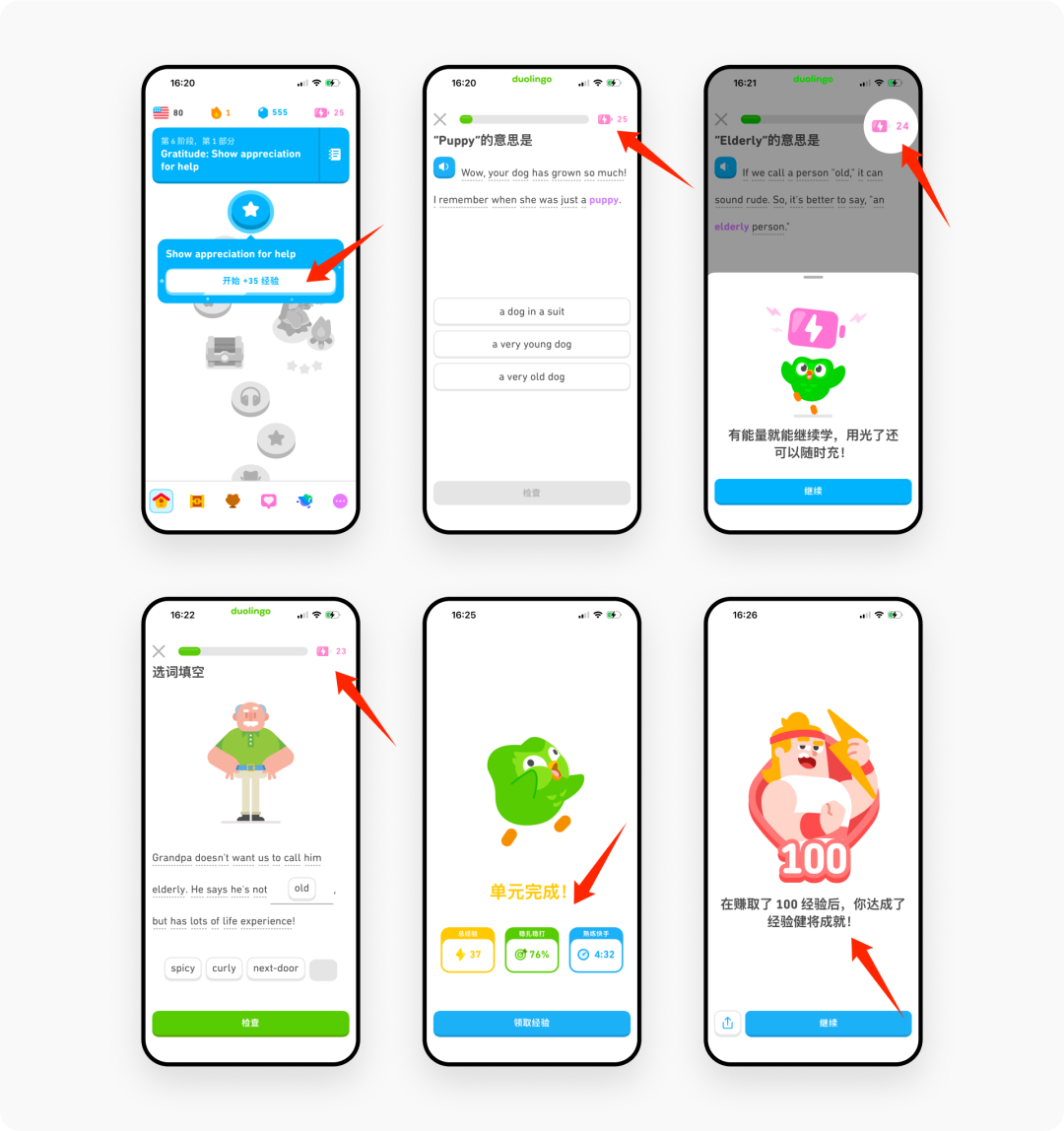 多邻国为用户的每一次学习都加入"经验值"奖励:无论是开始新课程、挑战传奇等级,还是复习旧内容,都会给予相应奖励。这让用户总能看到下一个触手可及的里程碑。