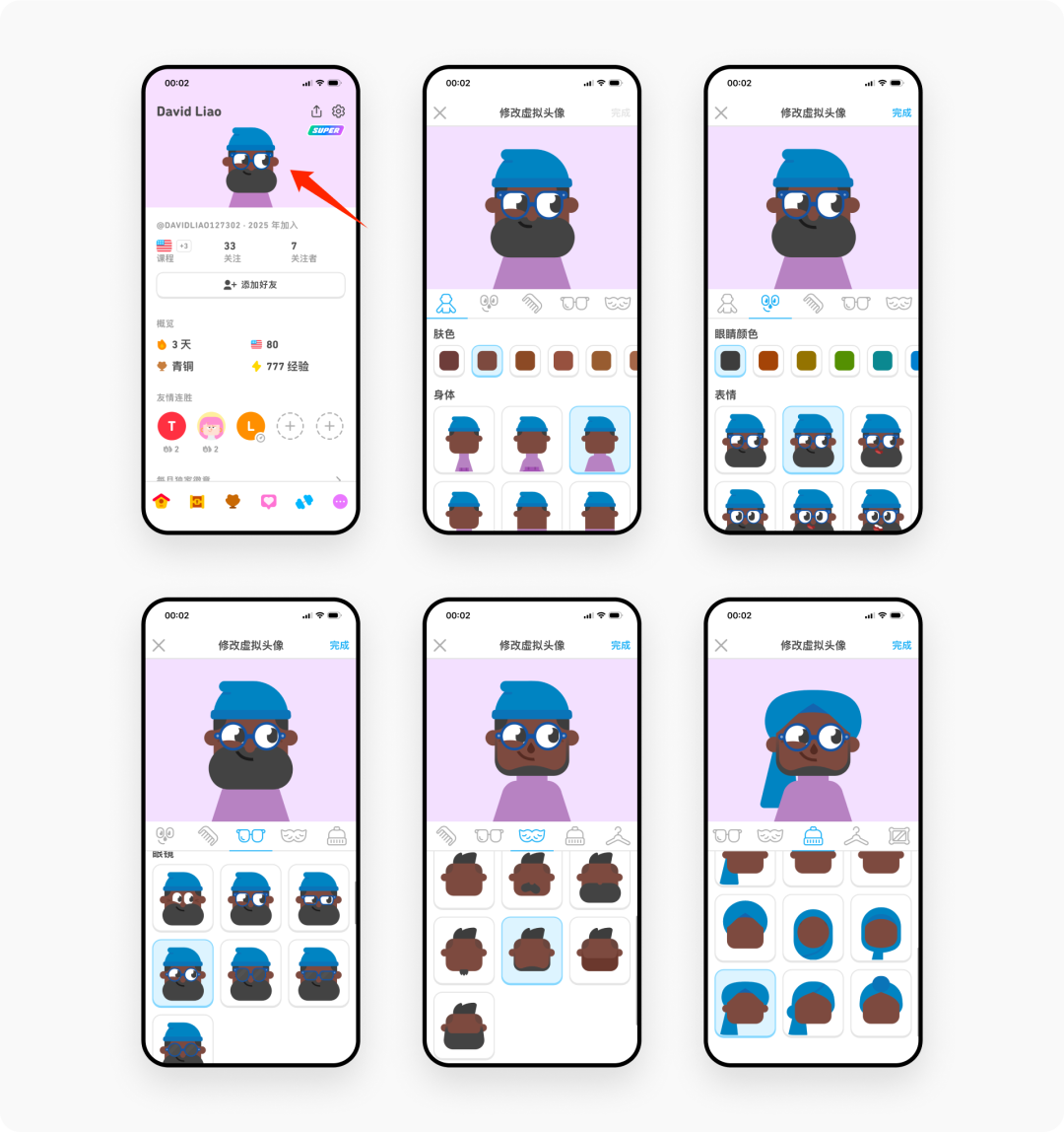 多邻国的视觉风格独树一帜,辨识度极高,这一设计理念贯穿于产品的每个功能。头像设计尤其个性化——用户可以根据个人偏好自由选择肤色、发型、衣服颜色等元素,拥有充分的自主权。这种让用户"亲手打造"头像的方式,能显著提升心理所有权与身份认同,从而提高留存与分享意愿,实现个性化 × 可控性的平衡。