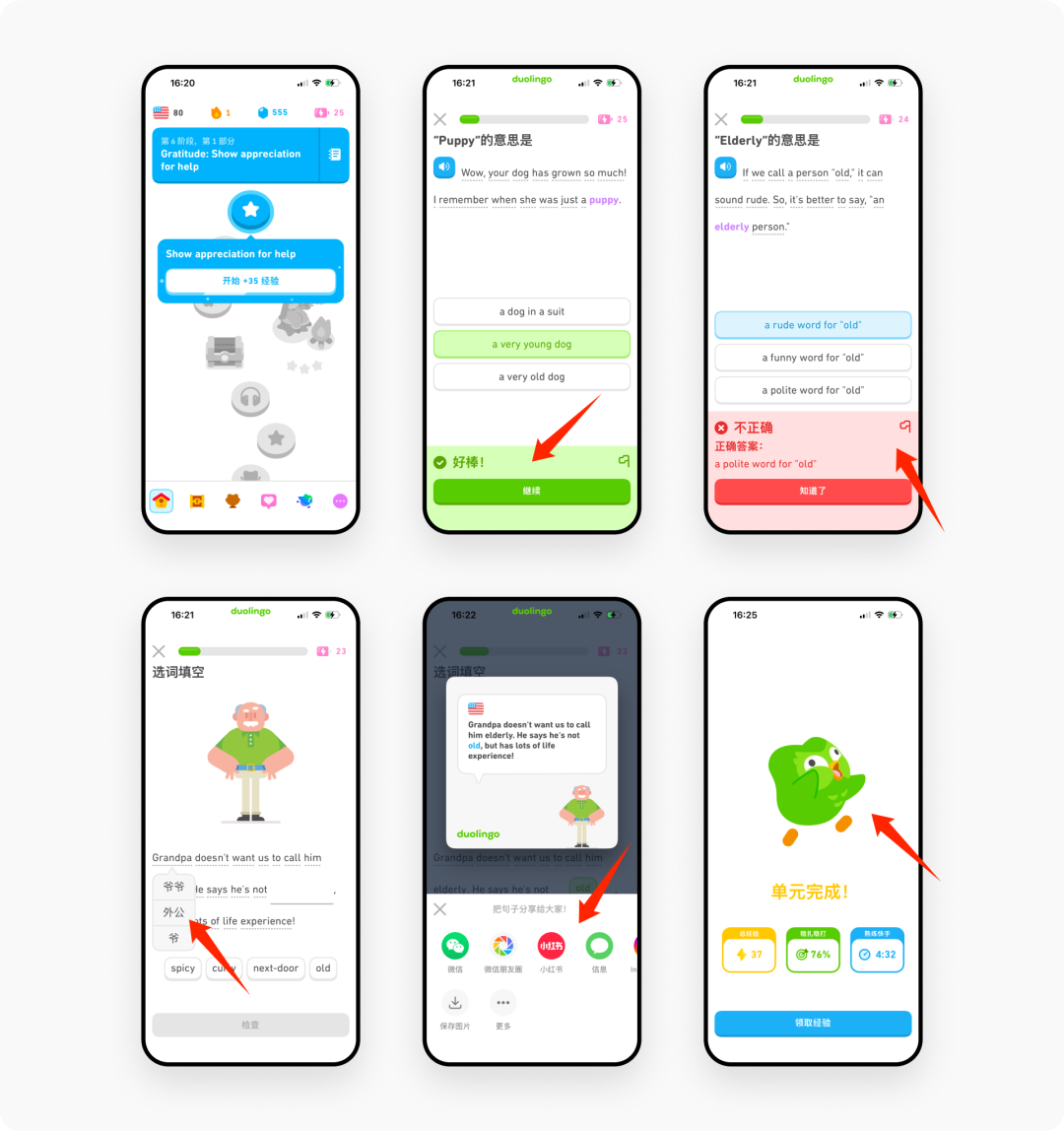 作为多邻国最核心的功能,这里既是用户的学习空间,也是与产品交互的主要场景。多邻国将即时反馈机制融入整个学习过程,通过视觉与情绪的双重信号强化学习动机。这种"边学边奖"的反馈方式能有效提升学习者的专注度与自信心,通过正向情感驱动形成长期学习习惯——这正是教育产品维持高留存率的关键。一旦忽略这些即时反馈细节,整个产品体验将大打折扣,千万不要忽视这些微交互细节。