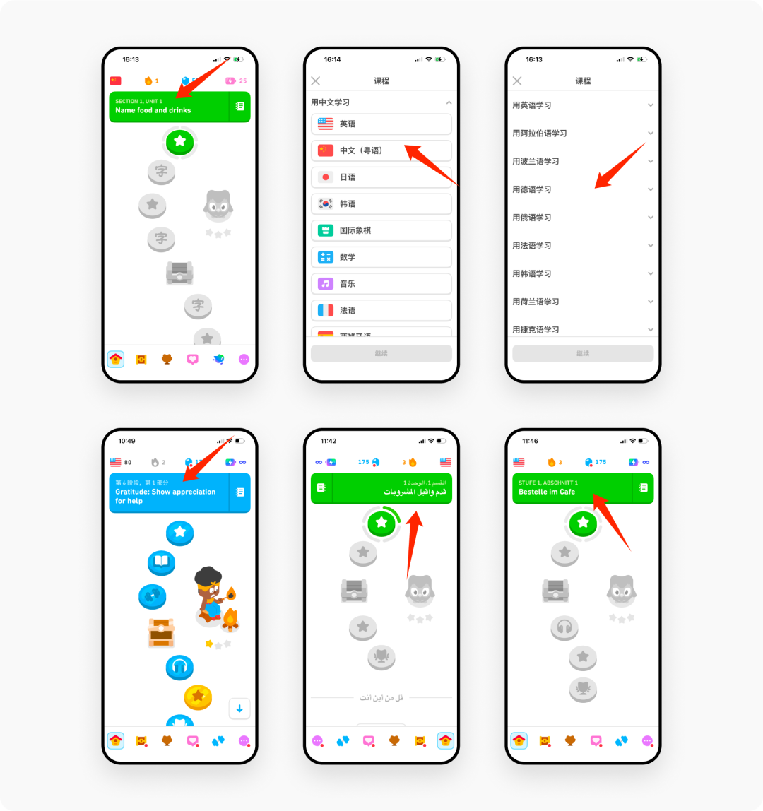 - 多语言入口:课程选择页按"母语—目标语言"逻辑分层展示,帮助用户快速找到符合自身语言背景的学习路径。