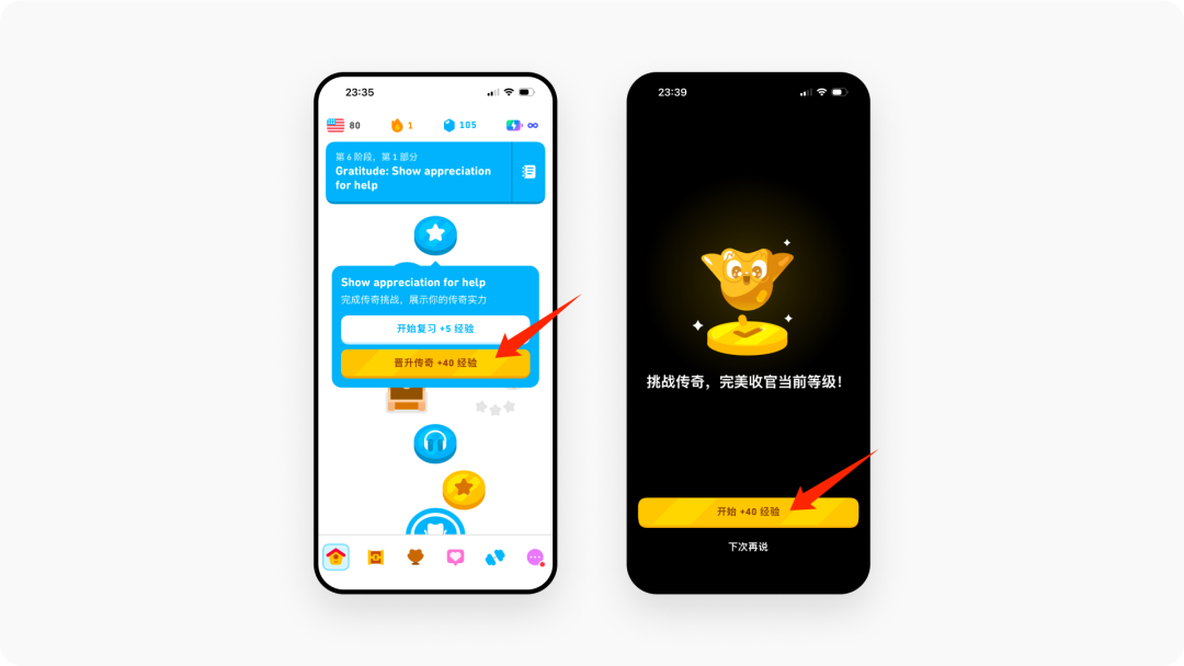 在单元开始前、学习中与完成后,多邻国会给出不同的"下一步"激励:开始前提示"可获得 XX 经验",完成后提示"复习再得 XX 经验",通过考核则解锁"传奇等级"。同时,地图上还埋入可点击的小人或图标,点击后进入轻量挑战或小游戏。整套设计将"学习—复习—进阶—彩蛋挑战"串成连续反馈链,持续拉动用户投入。
