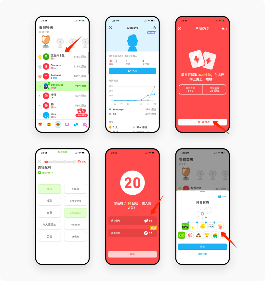 以多邻国为例,它采用了"简单框架 + 多层激励"的设计策略——核心机制(XP 积累与段位晋级)简洁易懂,但通过限时挑战、赛季重置、段位分层等元素持续制造新鲜感。这种设计比普通排行榜更具多变性,既降低了新用户的理解成本,又为老用户提供了持续的挑战目标,在"易上手"与"耐玩性"之间找到了平衡。