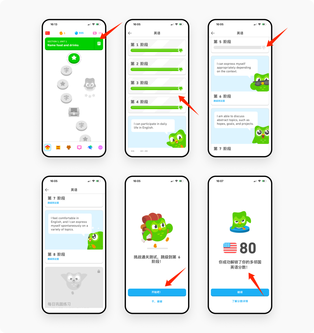 多邻国将课程分为不同阶段,这种循序渐进的设计运用了目标梯度效应(Goal-Gradient Effect)这一设计策略,将复杂的语言学习内容分阶段展开,使用户始终聚焦当前任务,避免认知过载。同时,通过可视化进度与激励机制,用户在短期目标中获得成就感,进而建立长期坚持学习的动力。值得一提的是跳级设计——这是一种灵活的设计理念,让部分用户不受限制,可以进行全新挑战,丰富学习的乐趣和成就感。