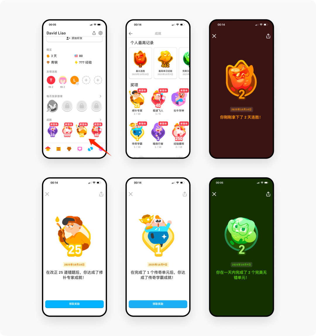 通过"个人最高记录 + 勋章清单"双层结构,将学习行为(连胜、纠错数、速度、传奇等级等)转化为可见成果。解锁时触发全屏庆祝与"领取奖励",形成"学习 → 获得勋章 → 领取奖励 → 继续学习"的正向循环。