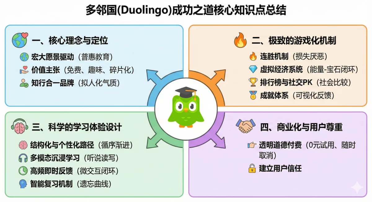• 循环闭环:学完→复习→获得奖励→解锁更高难度,正向循环将"短期反馈"与"长期目标"粘合在一起。