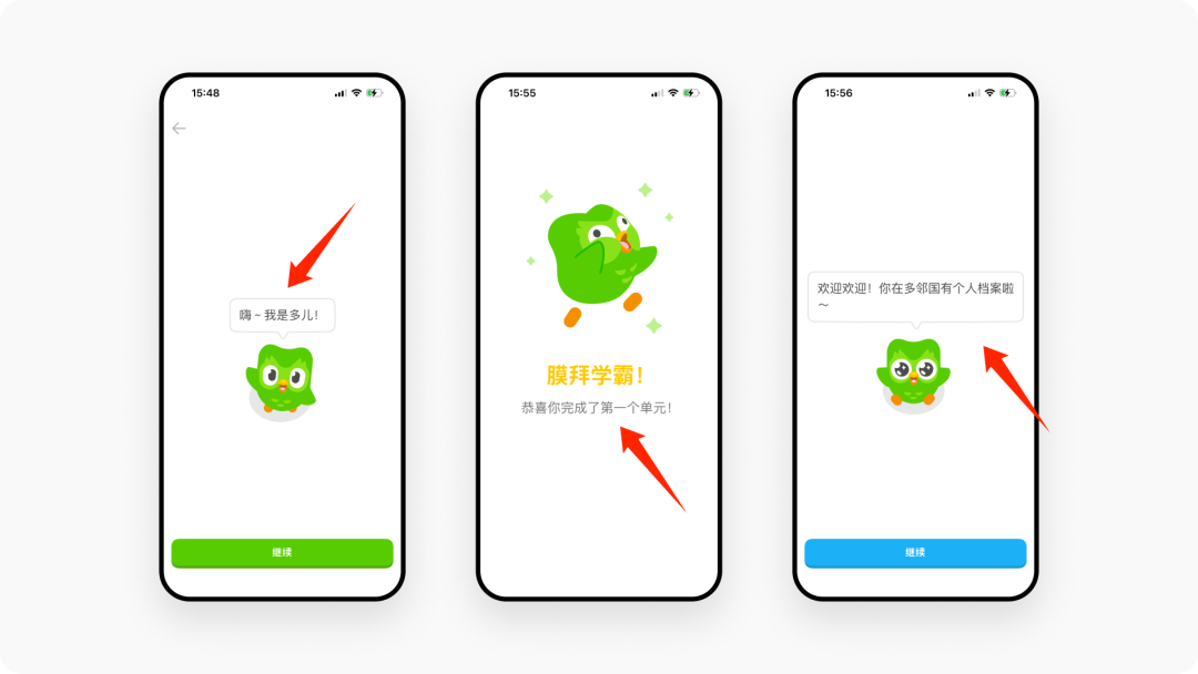 “嗨,我是多儿!”就是这样一句简单、轻松的开场白,为整个产品体验奠定了愉悦的基调。品牌 IP 的拟人化不仅拉近了产品与用户的距离,更通过形象传递出的氛围、温度和气质给用户留下深刻印象。相比 Airbnb、Vocabulary 等我们刚拆解过的国外产品,多邻国的 Onboarding 流程虽然看起来略显冗长(可能是国内用户不太有耐心),但实际上被这只可爱的猫头鹰化解了。因此,品牌 IP 形象的设计不容忽视——它不是一个静态的拟物标志,而是与用户快速建立连接的桥梁。