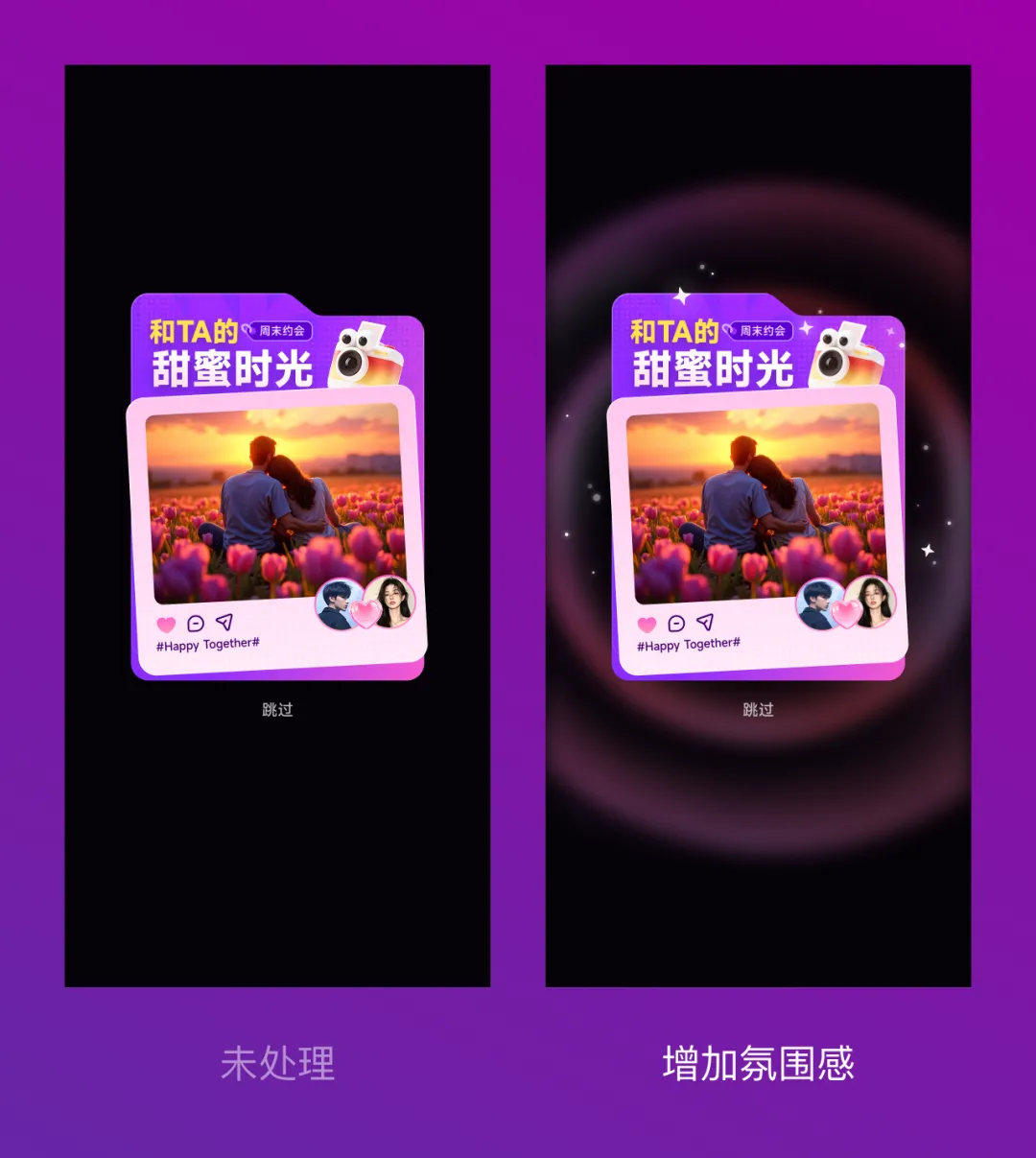 从优化前的弹窗中发现,弹窗的重点是展示情侣合照,通过照片能联想到拍照、社交媒体等,可以在设计中加入相对应的元素。比如加上一个相机作为装饰,另外还有社交媒体的点在评论转发图标,和标签: