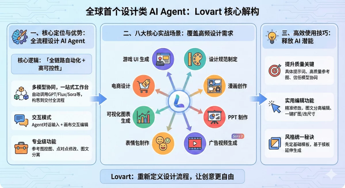 Hello,大家好,我是五月的枫叶,今天给大家介绍 lovart 超全实战用法。作为全球首个设计类 AI Agent,Lovart 凭借多模型协同能力和全流程设计工作台,彻底降低了设计门槛。针对设计师在工作中的一些高频需求,整理了 Lovart 在游戏 UI、UI 设计规范、漫画、PPT、广告视频、表情包、电商设计、可视化图表等七大场景的核心用法,附实操步骤和精准提示词,帮你快速解锁全功能。快来学习吧~