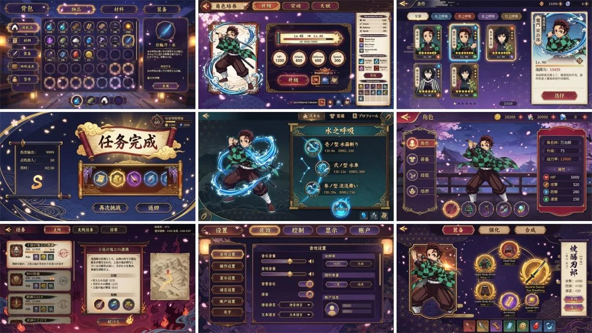 示例提示词:“参考原神游戏 UI 风格,生成鬼灭之刃游戏 UI 图,比例 16:9,分别生成游戏人物主页面,游戏结算页面,游戏人物技能页面”。