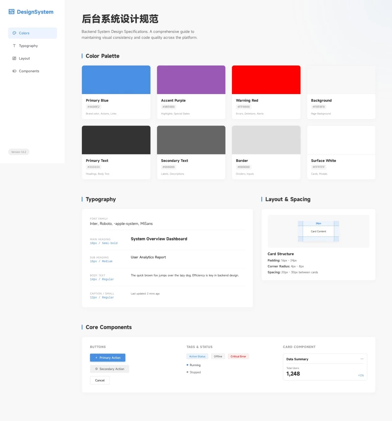 提示词:根据这个后台系统的 UI 界面,帮我生成后台设计规范,色彩、字体大小,字体颜色等。