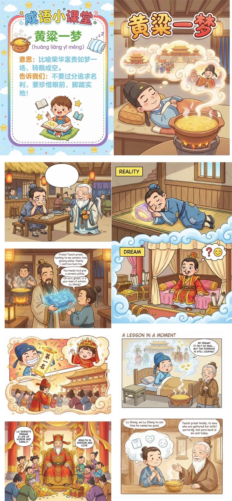 示例提示词:“生成一本《黄粱一梦》的成语故事解读漫画,给小朋友学习使用”。