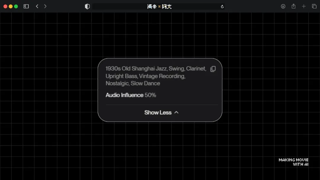 Suno 的一个优点是你可以对不满意的片段无限重生成。我们法国那条音乐做完后,把整首导出来再上传回 Suno,让它在保留旋律的基础上做上海那条的变奏。我们把音频影响度 Audio influence 开到 50%,这样能保证基础旋律不变,再告诉它加入萨克斯,做成老上海爵士的感觉,它就会在原旋律上做很合适的变调。