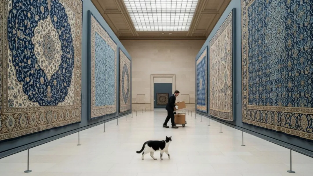 我们尝试过很多版本:魔法阵一样的花纹,镜头摇下去进入一个伊斯兰艺术世界,花纹从画面里凸起等。后来我们意识到“有意思”还不够,还需要情绪增量,于是用一个对比设计:开头用压抑的极端俯视,镜头运动到尾帧时进入一个巨大的开阔空间,让观众产生豁然开朗的感受。最终镜头里两侧的图案像传送带一样动,把猫带入一个开阔的展品空间。