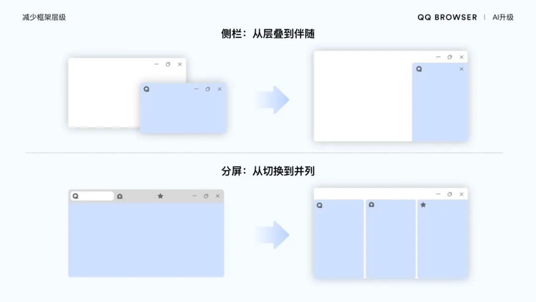 AI会使得用户在当前网页就能完成更多任务,反复切换会减少,三行框架整体高度不变的情况下,加大网页工具栏高度,更聚焦,点击区更大,使用更舒适。