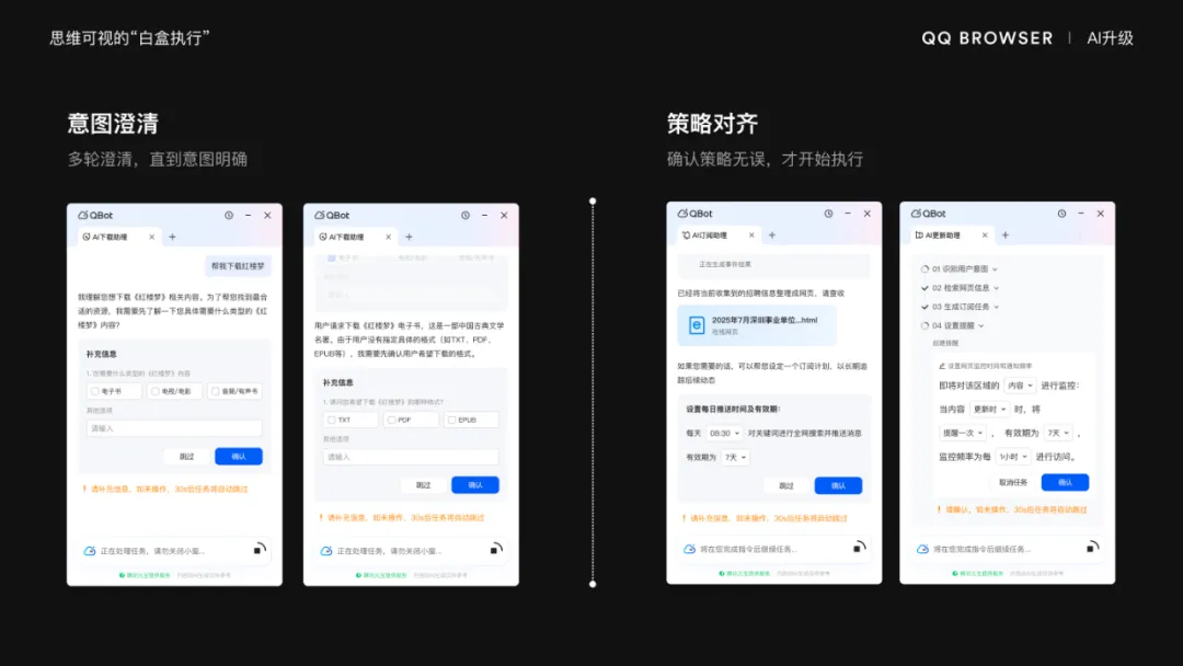 我们拒绝给用户一个简单的进度条。我们将 AI 拆解任务、检索信息、筛选决策的完整思维路径实时渲染在屏幕上。用户能眼见 AI 如何一步步逼近答案(如:正在搜索关键词 -> 提取筛选数据 -> 浏览网页)。这种动态的逻辑白盒,让用户像看着透明钟表运转一样,获得对智能代办的深度掌控。