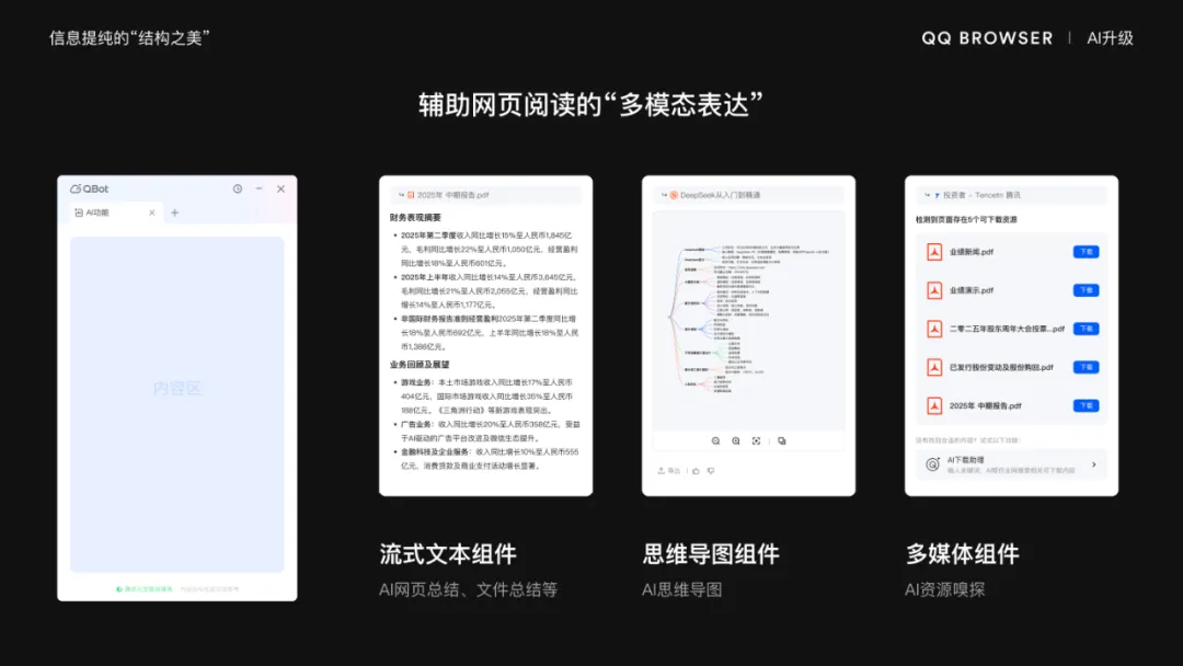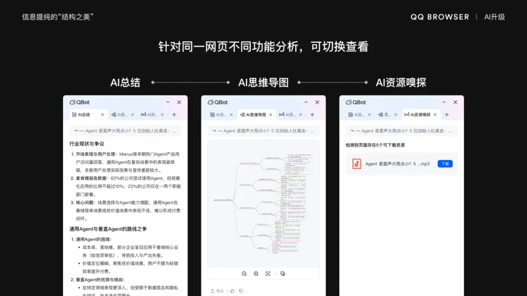为了让信息以最适合被吸收的结构呈现,我们在统一的智能容器下设计了不同的结果形态。AI 不再是单一的文本输出:需要网页总结,它输出结构清晰的流式文本 ;需要主线脉络,它直接渲染为可交互的思维导图组件;需要的是网页中的附件材料,它给出文中涉及的富媒体文件 。这种形态上的重塑,让用户能一眼看透信息的本质。
