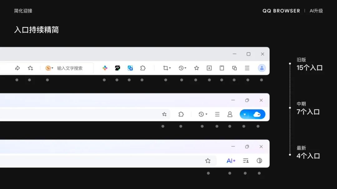 地址栏右侧的功能入口,进行了多轮的简化收折,最新版固定入口已精简到4个,识别场景需求后,功能会适时出现。