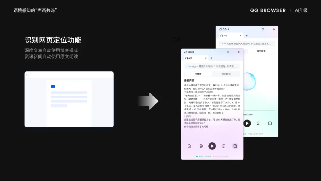 AI 听具备“页面类型感知”能力:识别到深度文章时,自动锚定为“播客模式”;识别到新闻资讯时,切换为“原文朗读”。在浏览网页时,它还会通过运营态气泡主动提示“可开启听模式”,在最合适的语境下提供服务。