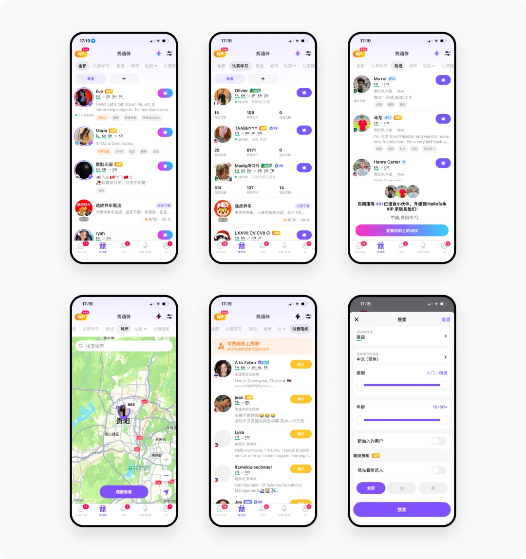 在 HelloTalk 的官网,映入眼帘的第一句话是——与世界对话,通过与全球母语者聊天免费学习语言。这正是 HelloTalk 的产品差异化所在。在这里寻找语伴不是随机匹配,而是一个高度可控、可筛选的过程。用户可以像使用成熟社交平台一样,按语言、地区、城市、性别等多个维度,主动寻找符合自己偏好的语言学习对象。这让 HelloTalk 看起来更像一款社交产品,只不过它的社交目标是"学好一门语言"。