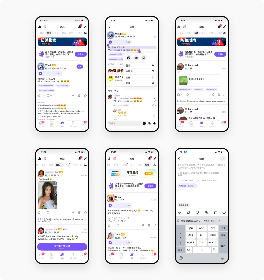 HelloTalk 的使命是"构建跨文化爱好者的交流平台"。平台提供多种实时互动场景——聊天、动态圈、互动直播和语音聊天室,构建真人互动的社区环境。同时结合 AI 翻译、AI 纠错、真人朗读和语音识别等功能,提供丰富的人机交互体验,并配合系统化课程增强学习效果。