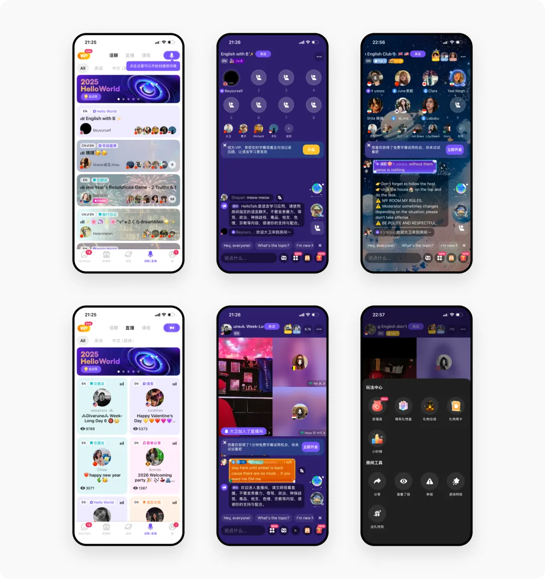 - 多模态实时交互矩阵:深度整合实时字幕试用、连麦序列展示、国旗头像层叠等视觉元素,极大地降低了用户开口沟通的心理防御,营造出真实的“数字英语角”氛围。