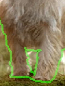 动物的边缘一般都有毛发,因此宜使用较大的画笔。而人物由于有衣物覆盖,大部分边界是清晰锐利的,所以应该用较小(为1也很正常)的画笔绘制。如果人物有飘扬的长发这类图像,视同"长毛"处理即可。在绘制边界的过程中最好是〖空格_CTRL_单击〗放大图像后操作,这样会比较精细。