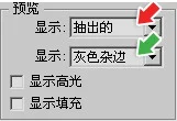 在完成绘制并填充后,点击"预览"按钮就可以直接看到抽出后的效果。在如下左图绿色箭头处的预览选项中可以选择预览背景的颜色。如果要修改设定,可在红的箭头处选择"原稿",并开启"显示高光"选项,图像会还原并显示出绘制的边界,此时使用画笔修改即可。