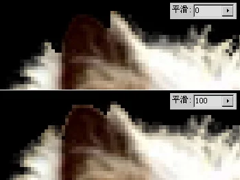 如果在预览效果中边界有较明显的毛刺感,可尝试增加平滑度。如下右图是两种平滑度的对比。可以看出增加平滑度后边缘的判定有所改变,一些原先看不到的部分出现了。但注意耳朵的上边缘,平滑度0的效果要比平滑度100好。实际上修改平滑度能改变的范围很有限,且也可能同时造成部分边界的质量下降。因此应将其保持为0或使用较低的平滑度。遇到不满意的边界时应使橡皮工具擦除后重新绘制。