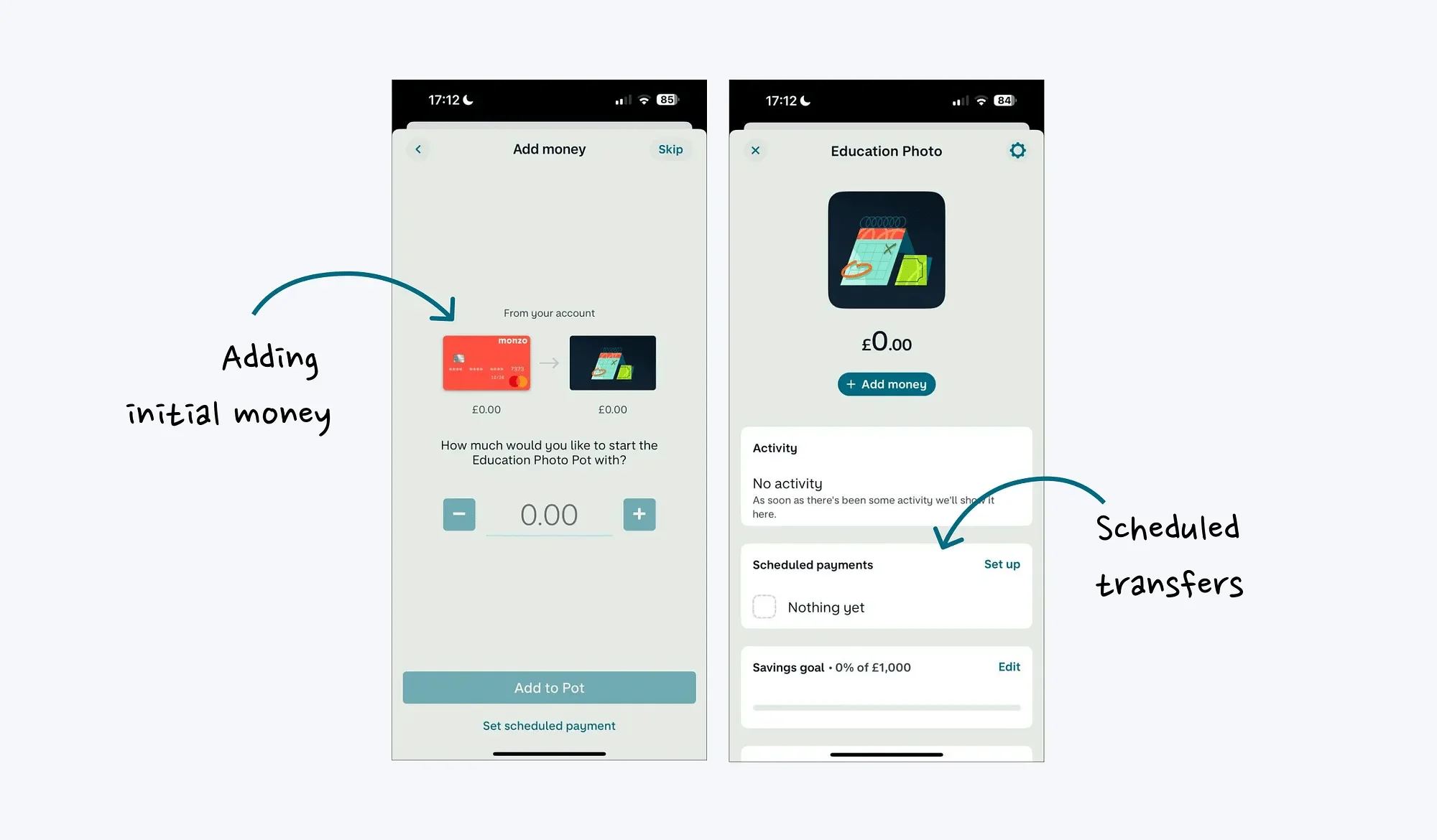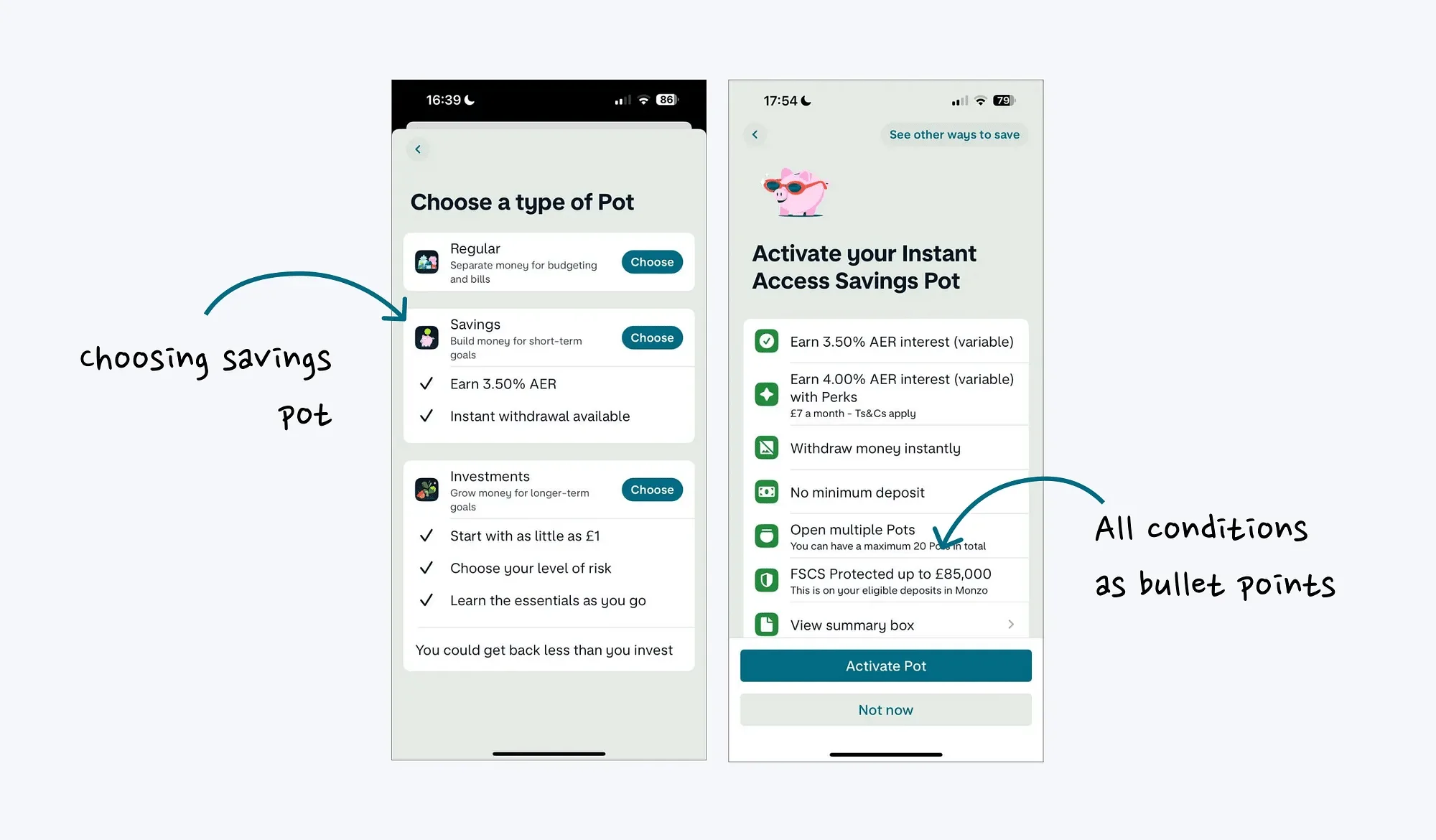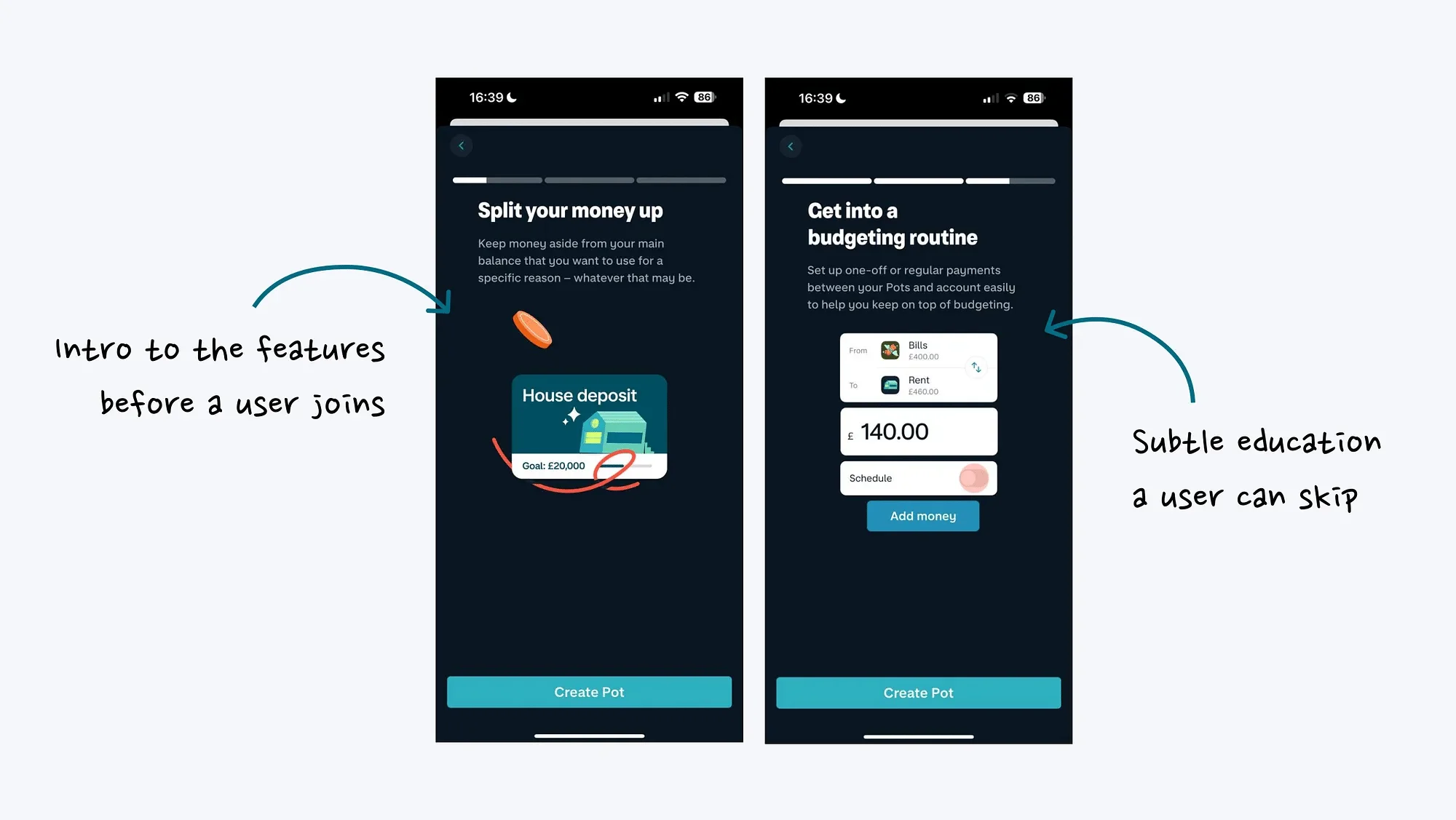 当你刚刚进入 Monzo 的时候,它会通过几张幻灯片介绍了 Pot 功能的主要优点,以帮助用户了解其潜在价值,并了解如何将其应用到他们的生活中。