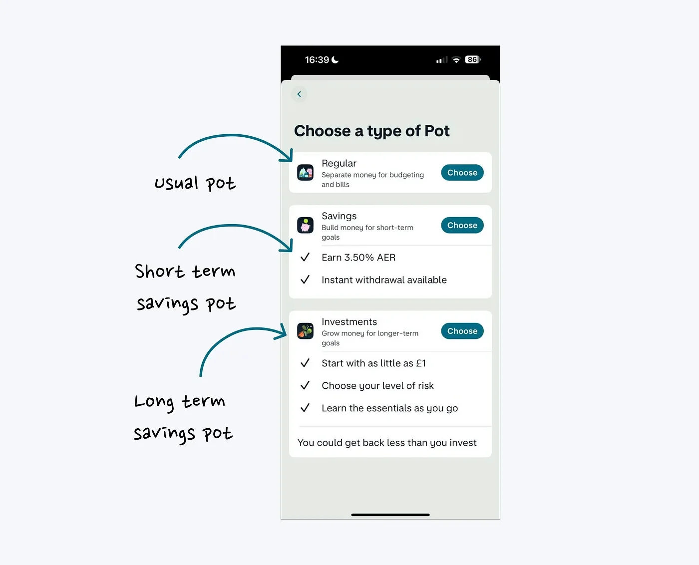 而 Monzo 所使用的概念隐喻就是我们之前所说的罐子 pots,在经过引导之后,用户必须选择一种自己所偏好的储蓄模式,以及相应的罐子: