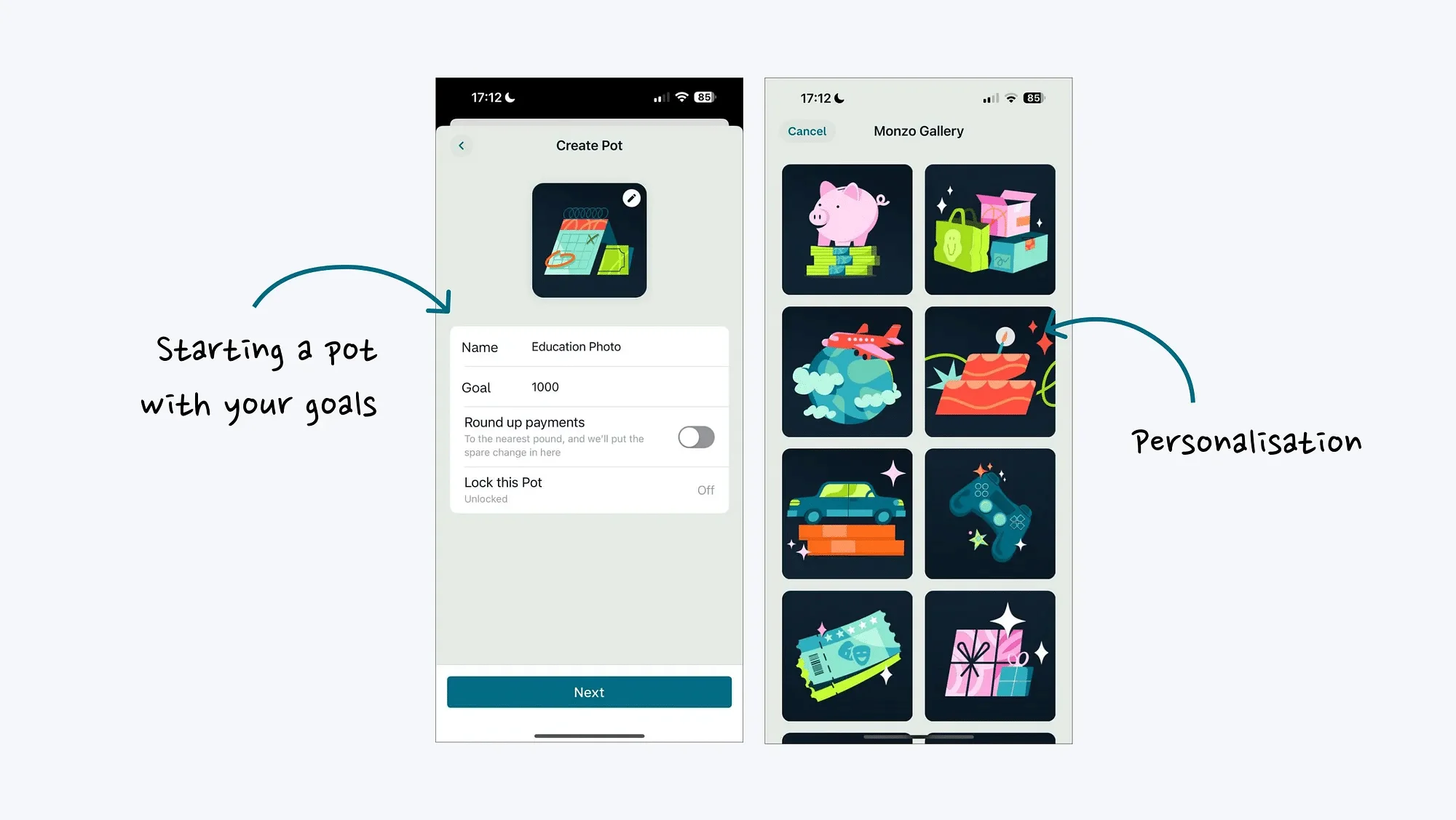 然后,系统会提示用户为每个储蓄罐添加图片,与你的理财目标建立情感联系。他们可以锁定储蓄罐,并自动凑整付款以补充账户。