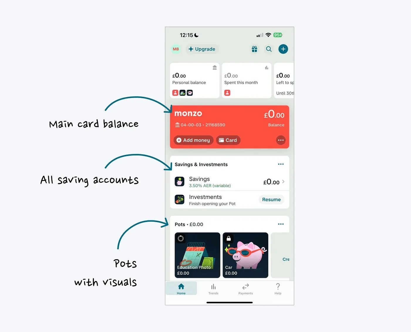 Monzo 通过提供微观和宏观视图来解决这个问题。它让用户可以深入了解账户余额情况,同时显示总资金和总储蓄的情况。