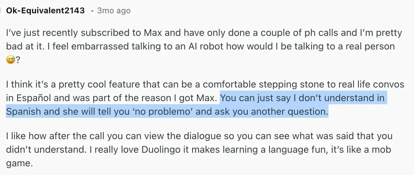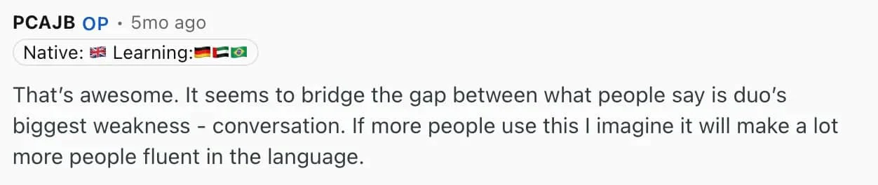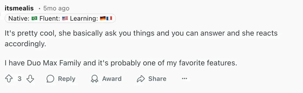 「太棒了!这个功能似乎修复了大家所说的 Duo 的最大弱点——对话功能。如果更多人使用这个功能,我能想象这将使更多的人流利地使用某种语言。」