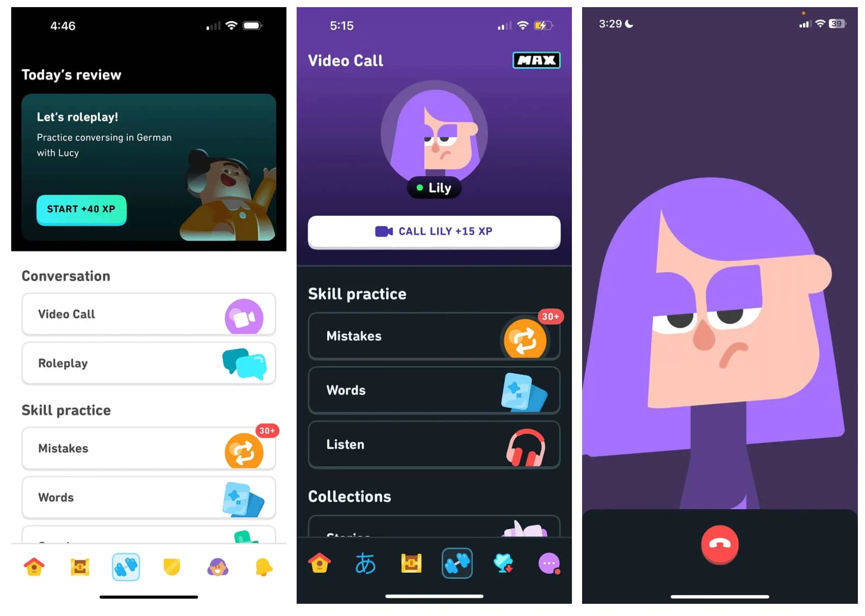 Duolingo 推出与 AI 角色视频通话功能,可以帮助用户练习口语。